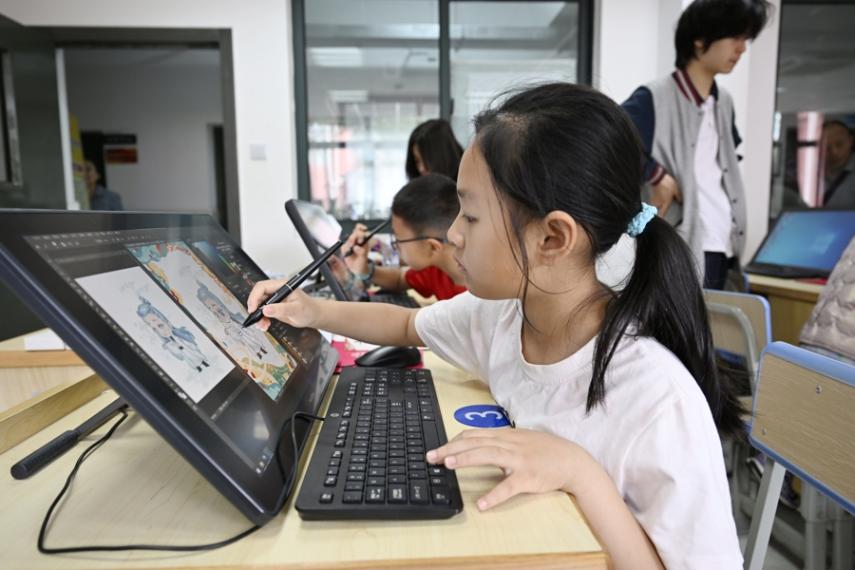 在上海市第二輕工業學校,孩子們在體驗“AIGC繪畫·哪吒2之魔童鬧海”項目