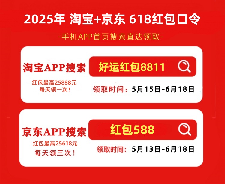 一、618紅包口令快收好!每天1分鐘躺著撿錢京東:打開APP搜「紅包588」,每天領3次,晚8點有機會額外加碼,最高能中25618元!重點:首次搜索后,下次直接點搜索框歷史記錄就能復領,懶人福音get√ (相當于每天白撿一杯奶茶錢)淘寶:搜「好運紅包8811」,每天1次,連續7天中10元+不在話下!隱藏玩法:分享任務得能量紅包,第一階段可領16元,和閨蜜家人一起薅才香~劃重點:紅包無門檻!可以合并一起用,但是要注意過期時間!二、618時間軸攻略:這3天必須定鬧鐘!京東:- 5月31日晚8點:百億補貼日,iPhone 16、戴森吸塵器直接地板價,錯過等一年!- 6月15日-18日:跨店滿減,PLUS會員日(6月17日)折上折,買家電直接省出一部手機錢!- 6月18日0點/12點/20點:各種優惠不間斷!淘寶:- 5月13日晚8點:預售定金膨脹10倍!100元抵500元,護膚品、小家電提前鎖低價。- 5月16日晚8點:現貨「官方立減15%」,衣服、日用品隨手買都便宜,不用湊單超省心!- 6月中旬:全品類滿減+88VIP券(滿5000減400),買家電、數碼直接省到肉疼!
