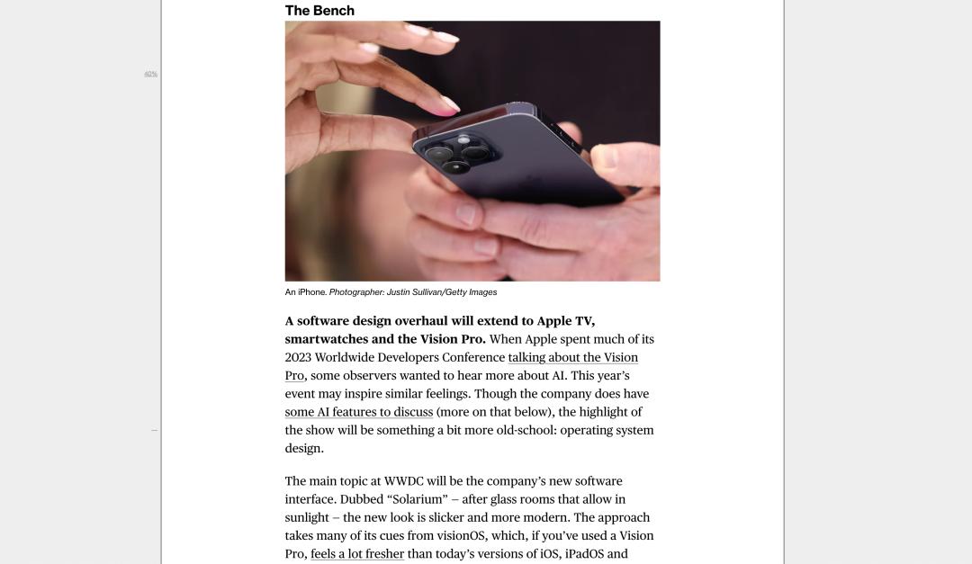 另一個值得關注的議題是蘋果的 Apple Intelligence(蘋果智能)。盡管許多用戶猜測 AI 功能會成為 WWDC25 的亮點,但 Gurman 表示,這次大會的焦點更在于操作系統的界面設計。