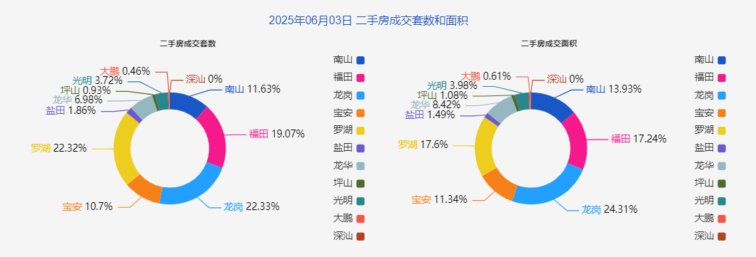 分區來看,在一手房成交套數中,排名前三的分別為龍華、南山和龍崗,三區各成交8套、5套和5套。二手房成交排名前三的分別為龍崗、羅湖和福田,三區各成交48套、48套、41套。