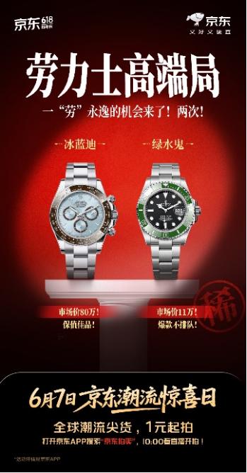 6月6日消息 從勞力士冰藍迪、潛航者型“綠水鬼”,到愛馬仕Kelly desordre和Birkin25,再到泡泡瑪特Labubu全家桶、100款奧特曼玩具大禮包……6月7日,京東潮流驚喜日即將來襲,匯集大牌奢品、名牌腕表、動漫周邊等全球稀缺潮流尖貨,在京東拍賣通通1元起拍!