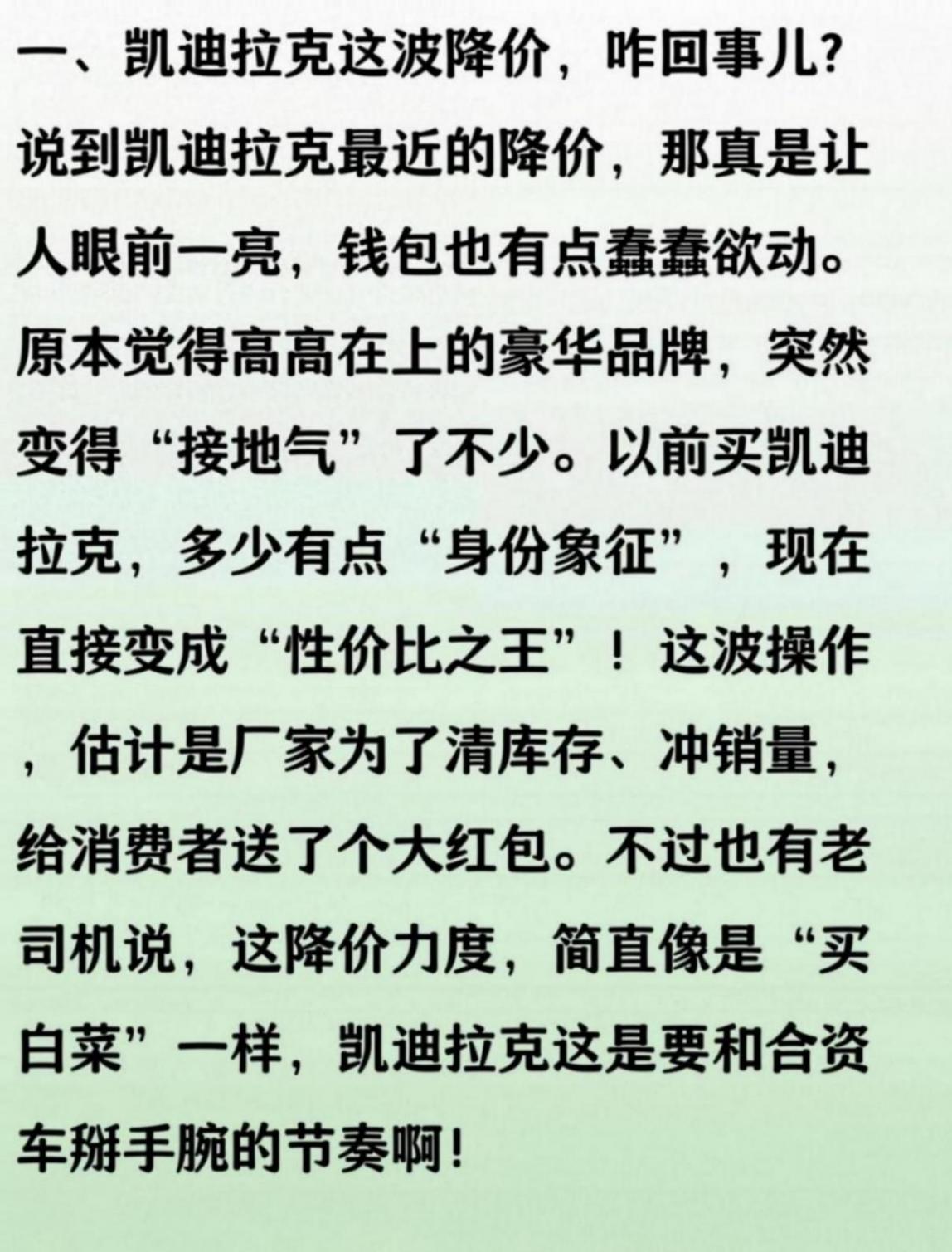 我哥們前兩天拉我去看車,說凱迪拉克現(xiàn)在便宜得跟白菜似的,4S店里人一堆,銷售臉都快笑裂了。我們倆一進門,茶水小點心端上來,啥優(yōu)惠都往外蹦,落地價比我前年買那臺日系車還低。我一合計,買個豪車牌子,花個合資的錢,這事擱以前想都不敢想。車友群里都炸鍋了,有人說庫存太多,有人說新能源沖擊,反正現(xiàn)在不買以后還漲價誰信?