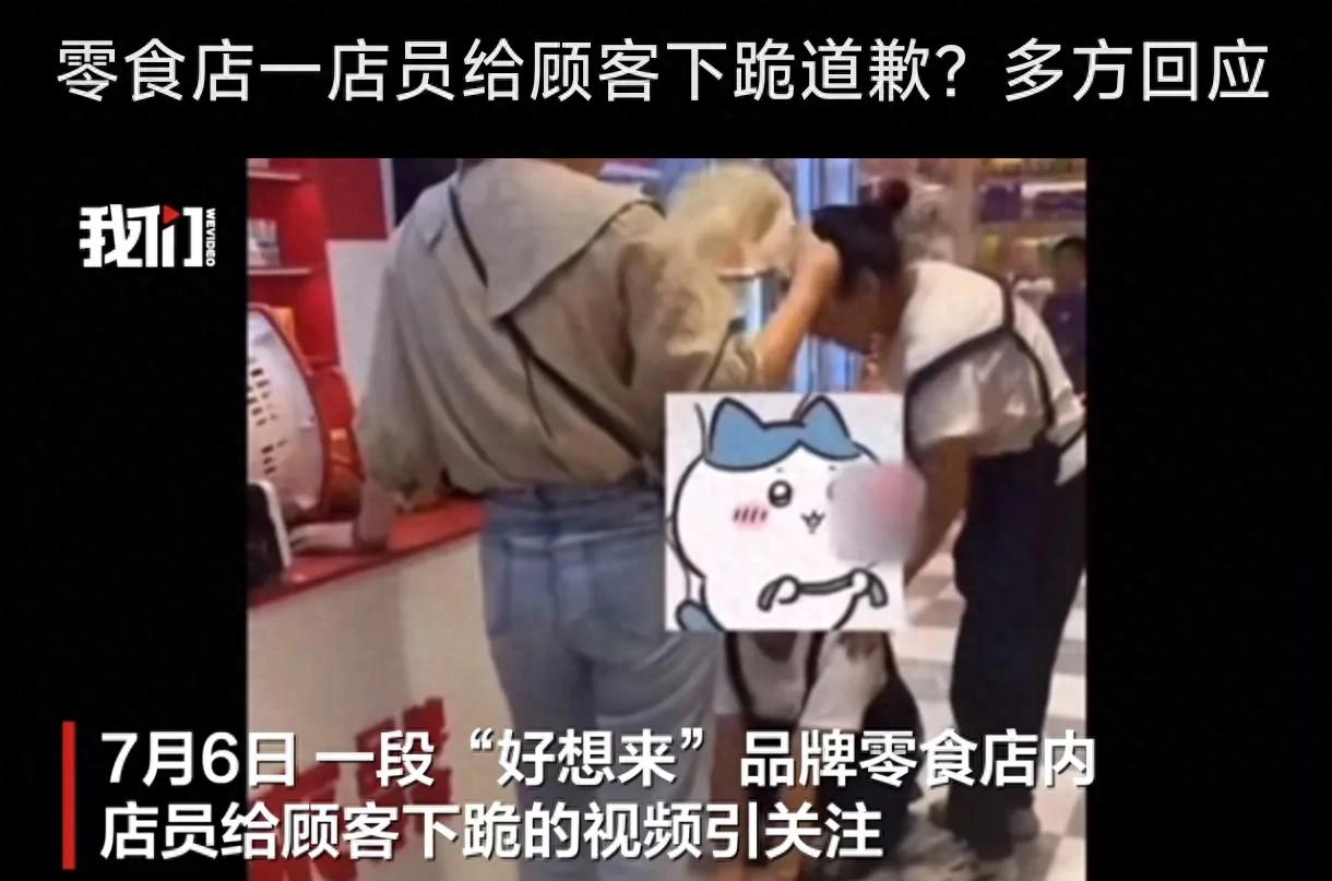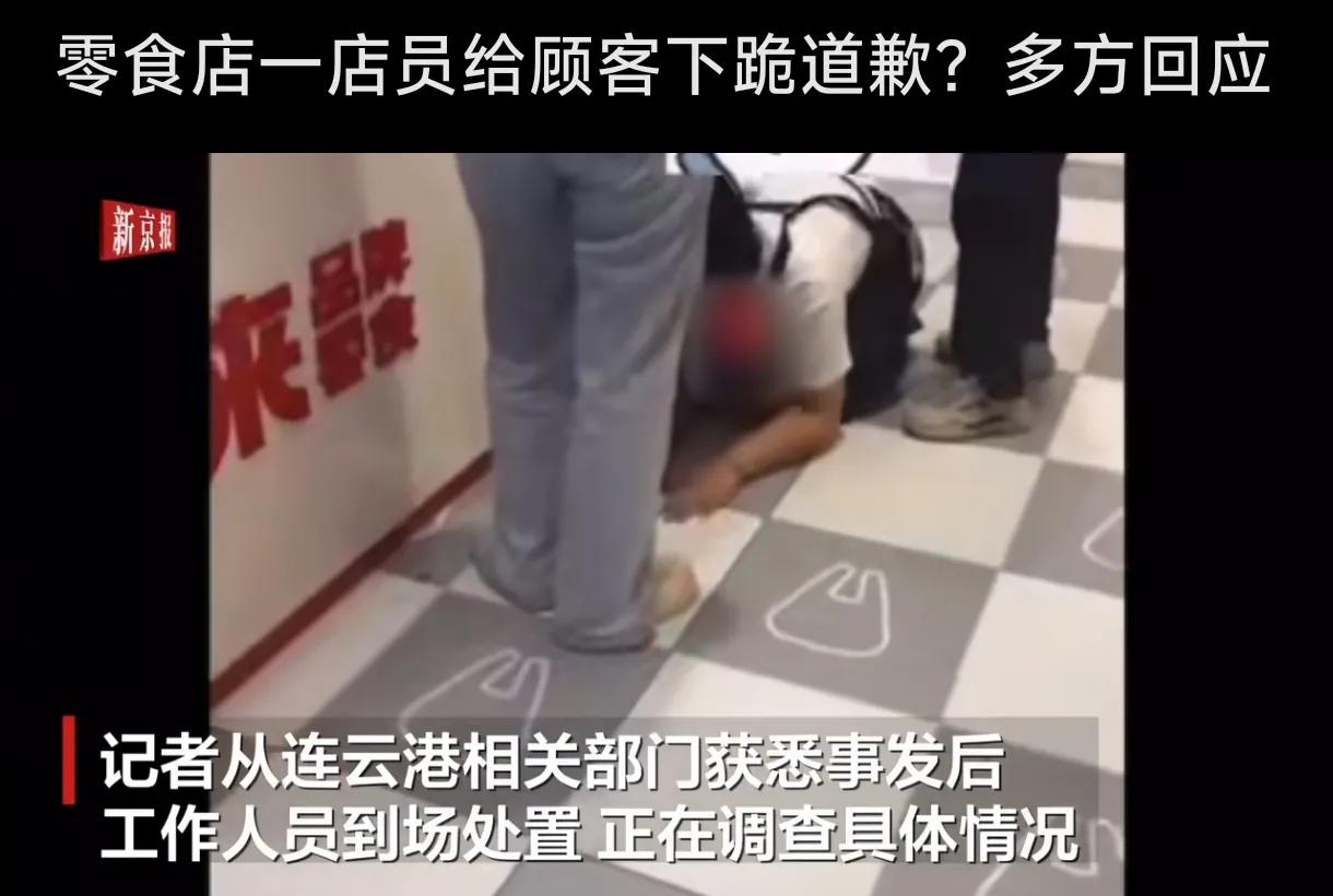 最近網上火了一段視頻,江蘇連云港一家“好想來”零食店里,一個穿著工作服的店員,“撲通”一聲,直接跪在了一位顧客面前。