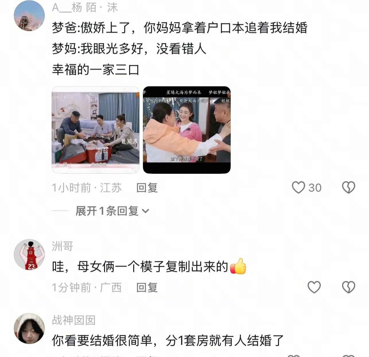 這一幕被網友們紛紛轉發和討論。有人感嘆父母的愛情故事令人羨慕,也有人表示對于這種瞞著家人偷偷結婚的行為表示擔憂。陳夢一家三口在社交媒體上的幸福生活引發了網友們的熱烈討論。夢爸笑稱:“傲嬌上了,你媽媽拿著戶口本追著我結婚。”這句話充滿了幽默和戲謔。夢媽則表示:“我眼光多好?沒看錯人!”這句話透露出她對于婚姻的堅定和自信。