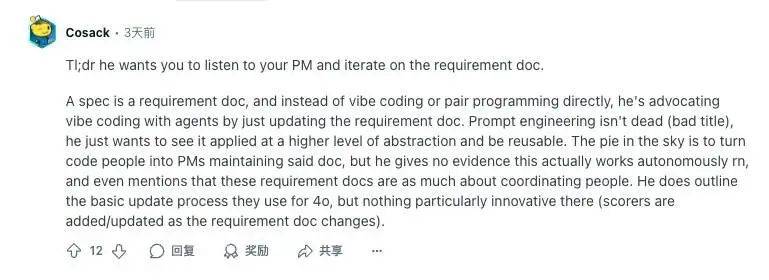 一位網友犀利地評論:這套思路本質上就是“多聽產品經理的話”,通過寫更好的規(guī)范文檔來驅動開發(fā)流程,并且從 Grove 的描述來看這種模式其實是把工程師變成“維護需求文檔的產品經理”。