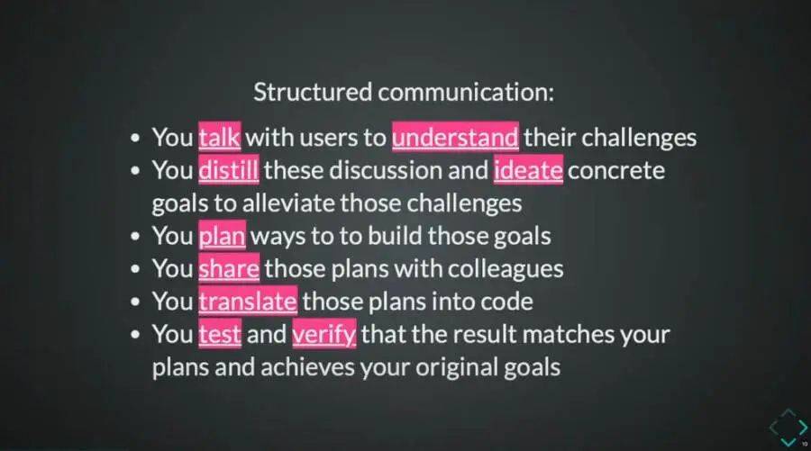 我們關注的是代碼對真實世界的影響,所以溝通、理解、提煉、構思、規(guī)劃、分享、翻譯、測試和驗證都是工作的重要環(huán)節(jié)。這些就是我說的結構化溝通,也是工作中最大的瓶頸所在。明確要構建什么、與他人溝通并收集需求,知曉如何構建、為什么構建,最終還要判斷構建是否正確、是否實現了最初的目標。