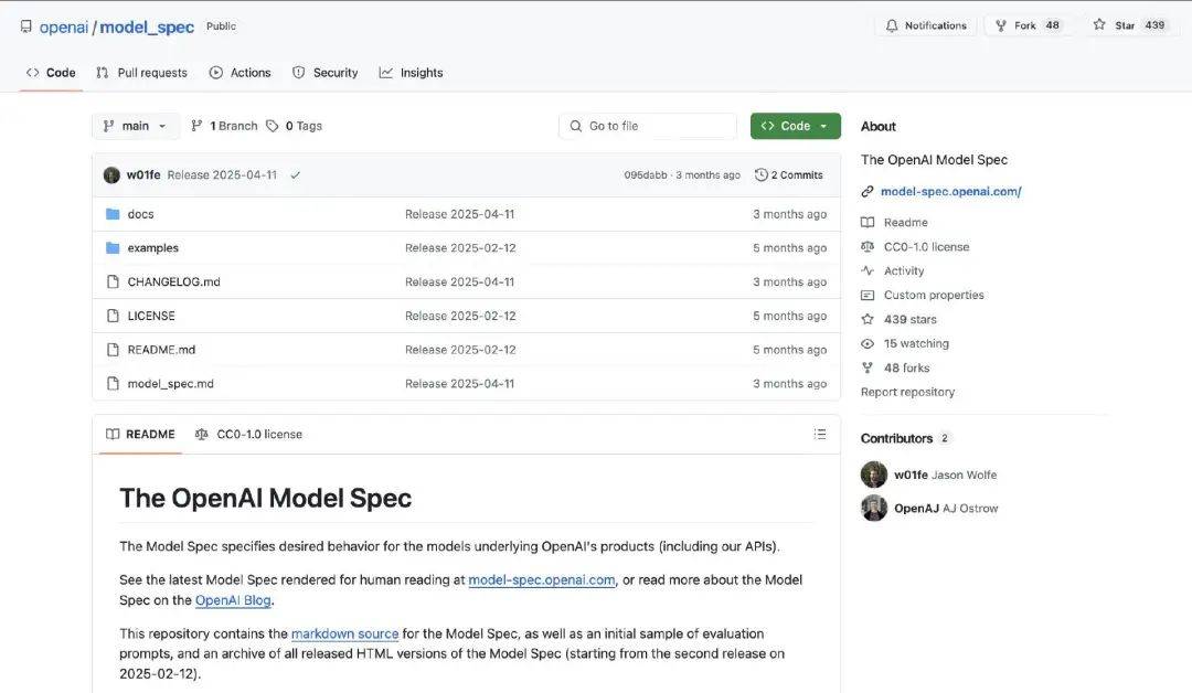 這份規(guī)范在今年二月完成了更新和開源,現在大家可以訪問 GitHub 查看模型規(guī)范的具體實現( https://github.com/openai/model_spec)。但意外的是,我看到的只是一大堆 Markdown 文檔。我不是說 Markdown 這種格式不好,它易于閱讀、支持版本控制,還包含變更記錄。而且因為是自然語言,每個人都可以為它做出貢獻,包括產品、法律、安全、研究和政策人員。他們可以閱讀、討論、辯論并為源代碼做出貢獻。這樣一來,大家就能圍繞同一套意圖和價值取向保持統一。
