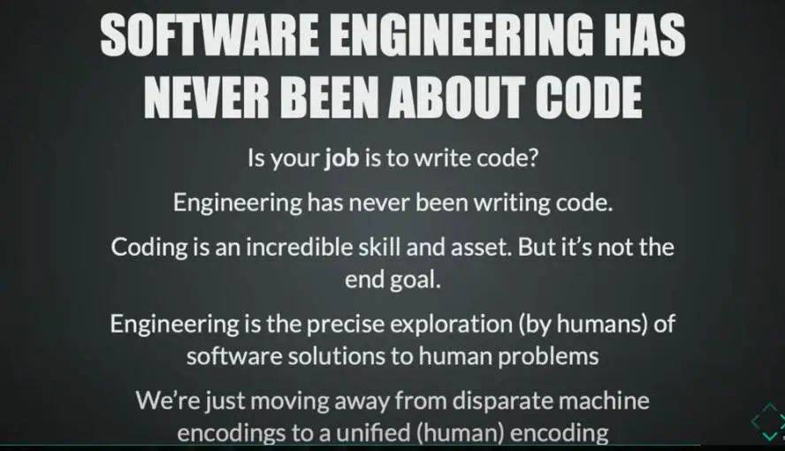 編程確實是一項重要的技能、也代表一種寶貴的財富,但絕非最終目標。工程的關鍵是人類對于軟件解決方案的精準探索,目標是解決人類的問題。如今的我們,正從各種不同機器編程轉向統一的人類編程,為的都是解決問題。
