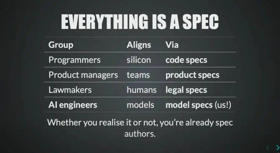 這其實是個非常普遍的概念。程序員的工作是通過代碼規(guī)范來協調芯片,產品經理通過產品規(guī)范來協調團隊。立法者實際是通過法律規(guī)范來協調人類。在座的各位,當我們輸入提示詞時,這代表的就是一種原型規(guī)范,其目的就是讓 AI 模型向著你預設的意圖和價值取向邁進。正是這種規(guī)范,讓我們能夠更快、更安全地交付產品。而且每個人都可以為規(guī)范做貢獻——包括產品經理、立法者、工程師乃至市場營銷人員,現在大家都是程序員。