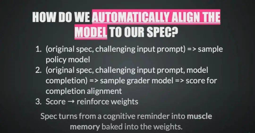 之后將獲得的響應、原始提示詞和策略輸入另一個更強大的模型,要求它根據規(guī)范對響應進行評分,包括對齊度如何等。如此一來,規(guī)范文檔就既充當訓練材料、也充當評估材料。根據得分,我們會強化具體權重,例如在上下文中引入規(guī)范,并在每次采樣時添加系統消息或開發(fā)者消息。雖然會占用一定算力,但卻能有效提高模型的輸出一致性。