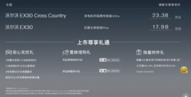 沃爾沃EX30 Cross Country,煥新專享參考價(jià)為23.38萬(wàn)元(截止至2025年9月30日),官方建議零售價(jià)為26.38萬(wàn)元。新車定位小型SUV,是沃爾沃EX30的跨界越野版本。在整體造型上加入了更多越野風(fēng)格元素,采用雙電機(jī)布局,匹配容量為66kWh的三元鋰電池組,CLTC工況續(xù)航里程為540km。