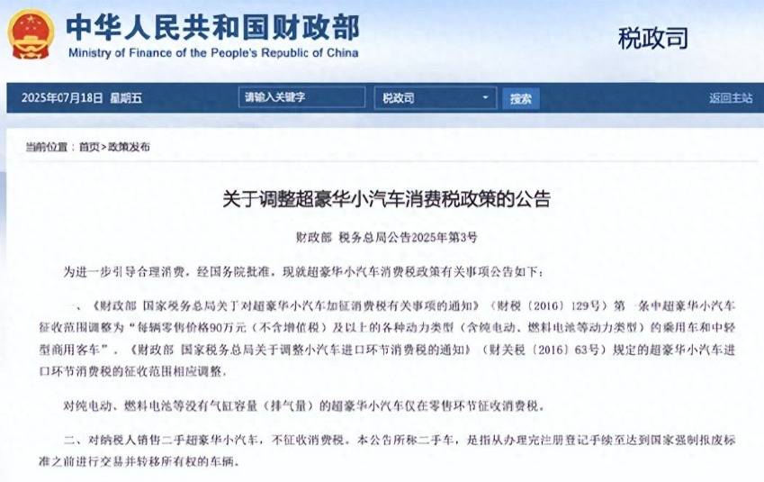 近日,財政部與稅務總局聯合發布公告,將超豪華小汽車消費稅起征點從 130 萬元(不含增值稅)大幅下調至90萬元,并首次將純電動、燃料電池等新能源車型納入征收范圍。這一政策于 7 月 20 日零時正式生效,留給車企和消費者的緩沖期僅有 72 小時。政策實施后,一輛含稅價101.7萬元的車型需額外繳納9萬元消費稅,而含稅價146.9萬元的車型稅負增加14.7萬元,相當于消費者一夜之間需多支付一輛緊湊型轎車的價格。