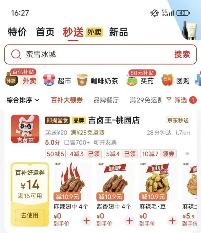 京東則是繼續強化滿減等補貼措施。在京東外賣“外賣百億補貼”中,一種是“百補新客券”,另一種是“百億餐補券”。對應的新客券補貼力度普遍較大,比如“15減14”“20減16”、“30減19”、“40減26”、“60減44”等,餐補券多為“15減10”、“20減12”、“60減32”等。
