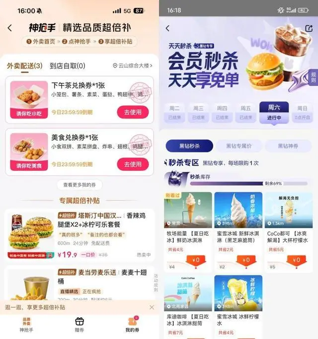 還有多個搶券入口,比較大力度的補貼是一個“各得16元外賣券”活動,提示用戶分享給好友后最高可得16元,也相當于是“0元購”了。