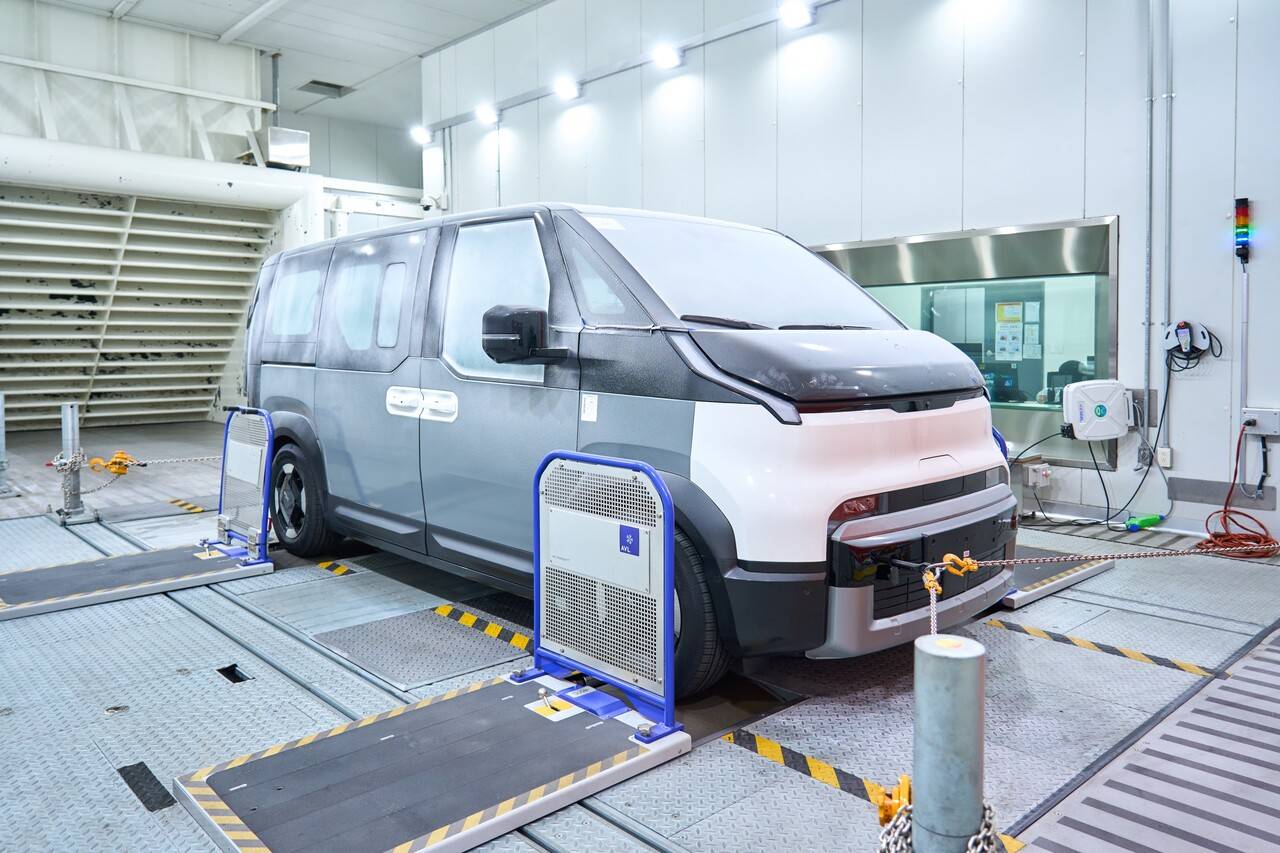 接著參觀的低溫環境風洞 chamber 正在測試近期推出的起亞 PV5。內部溫度設定為零下 20 度,車輛表面結著一層薄冰。在測功機上行駛的 PV5,仿佛行駛在嚴寒的北歐冬季道路上。