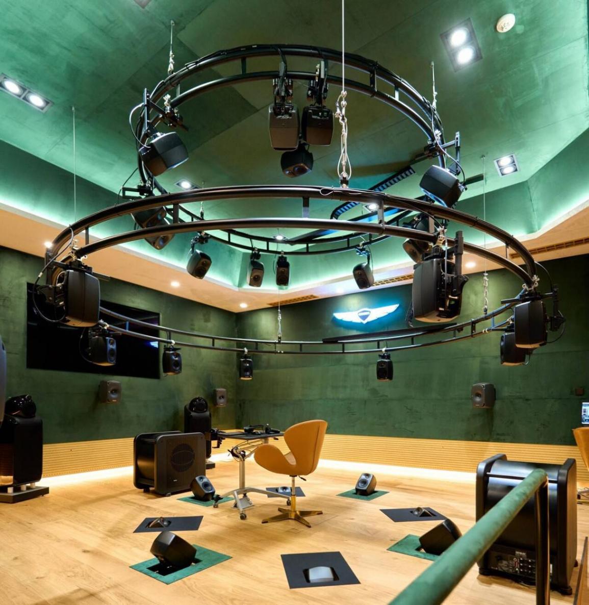 尤其值得注意的是,沉浸式聲學聆聽室以聆聽座椅為中心,精準布置了數十個揚聲器,一面墻上還裝有大型顯示屏。這里既能聆聽杜比全景聲(7.1.4 聲道),也能聆聽 4 階 Ambisonic(25 聲道)。