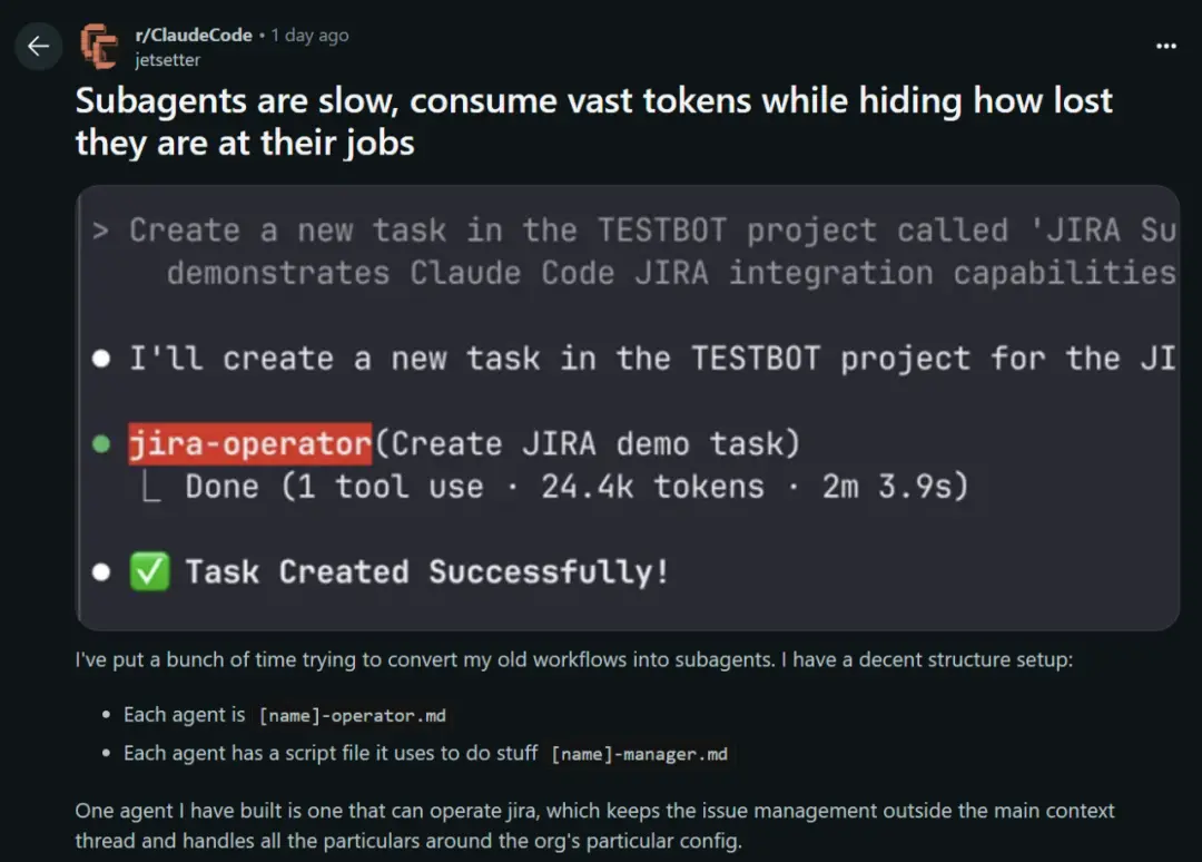 例如在 Reddit 上就有人抱怨子智能體速度慢、消耗大量 token 以及在執行任務時情況可見性有限。