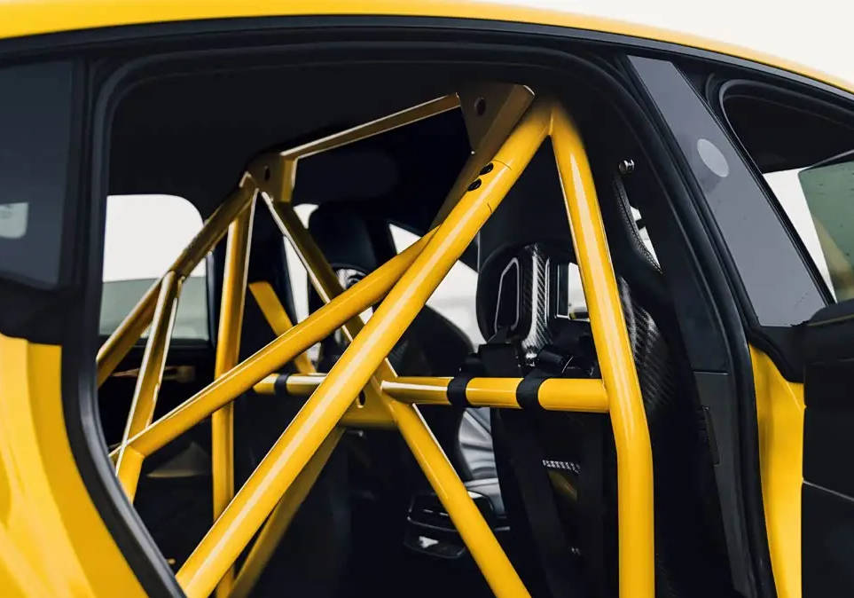 車內最大的亮點是使用了專業的賽車桶椅,并標配六點式安全帶,同時車內后排還增加了防滾架,在保障安全的同時,也強化了賽道氛圍。車輛內部采用了大量碳纖維裝飾板進行點綴,而且在中控副駕位置鑲嵌了限量版的銘牌標識,讓車輛的獨特性更加突出。