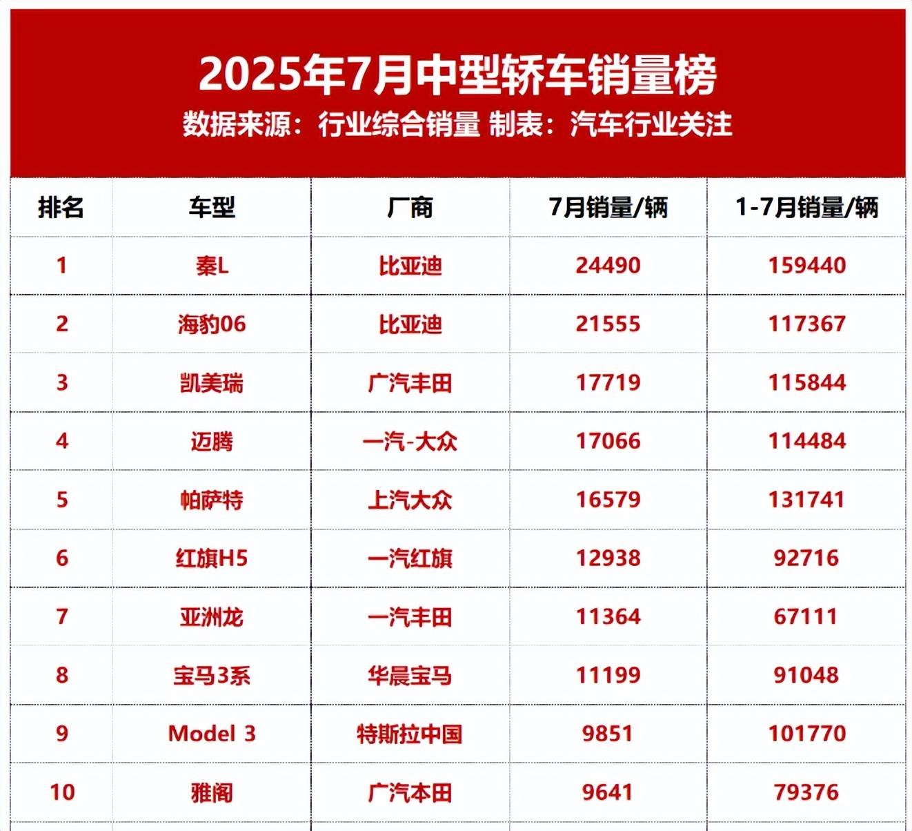 不過,伴隨著車市的大洗牌,國內市場的格局也產生了深刻的變化。從剛剛過去的7月份來看,B級車市場共有8款車型銷量超萬輛,分別為秦L、海豹06、凱美瑞、邁騰、帕薩特、紅旗H5、亞洲龍、寶馬3系。雖然在榜單前列還是有很多咱們熟悉的經典車,但也有一些傳奇車“風光不再”,比如