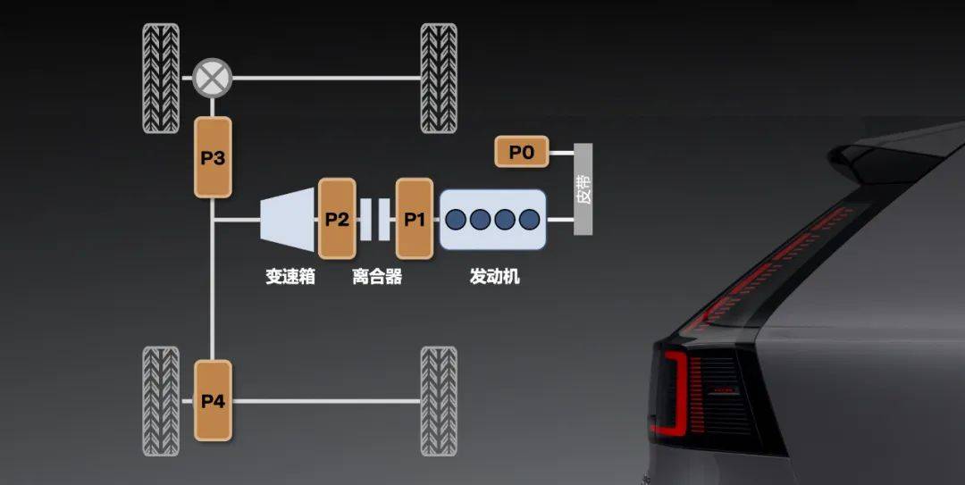 首先做幾個名詞解釋。在接下來談到的混動技術構型中,都會用到一個“P(n)電機”的名字,其中P即Position(位置),n為阿拉伯數字0~4,數字越大越“厲害”,數字越小越靠近發動機,傾向發電功能。
