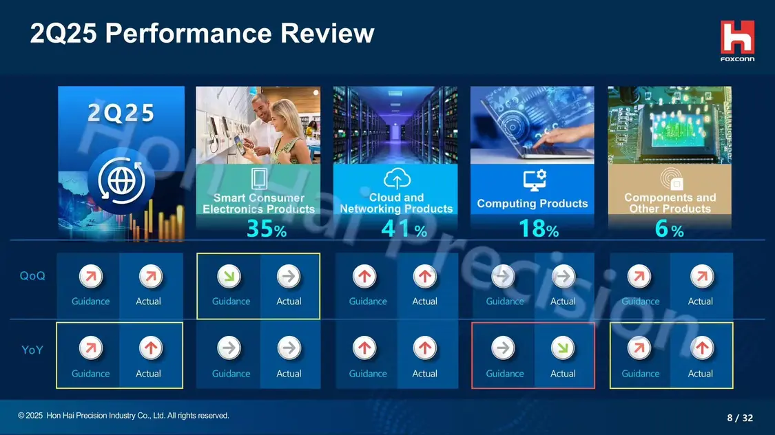 數據顯示,今年第二季度,富士康 AI 服務器營收首次超過 iPhone 等消費電子產品所創造的營收。“云和網絡產品”部門當季營收占比達到 41%,較 2024 年增長了 9 個百分點。除此之外,“智能消費電子產品”占比 35%,“計算產品”占比 18%,“元器件及其他產品”占比 6%。