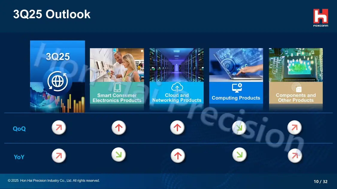 其輪值 CEO 楊秋瑾在昨日的 2025 年第二季度法說會上表示,鴻海 AI 服務器業務持續強勁。該部分業務 Q2 營收同比增長 60+%,預計三季度營收同比增幅有望進一步擴大至 170+%,而全年 AI 服務器可貢獻超 1 萬億新臺幣(IT之家注:現匯率約合 2390.43 億元人民幣)營收。
