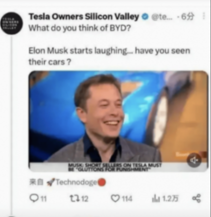 君記否,2011年汽車(chē)行業(yè)峰會(huì)上,狂傲的特斯拉在接受媒體采訪時(shí),是如何睥視倨傲的態(tài)度,如何傲慢得讓人恨得牙癢癢的語(yǔ)言?尚未成為全球首富的馬斯克露出標(biāo)志性的不屑神情,并且挑釁地反問(wèn):"你見(jiàn)過(guò)比亞迪的產(chǎn)品嗎?",繼而斬釘截鐵斷言:"我不認(rèn)為他們能對(duì)行業(yè)格局產(chǎn)生影響。"