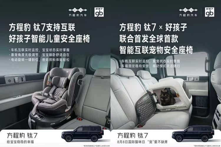 值得一提的是,鈦7還首發首搭了比亞迪新一代智慧生態,聯合gb好孩子推出了智能兒童安全座椅及全球首款智能互聯寵物安全座椅,將座艙體驗推向了新的高度。這一創新舉措,不僅體現了方程豹對家庭用戶需求的深刻洞察,更預示著鈦7在座艙科技領域的無限可能。