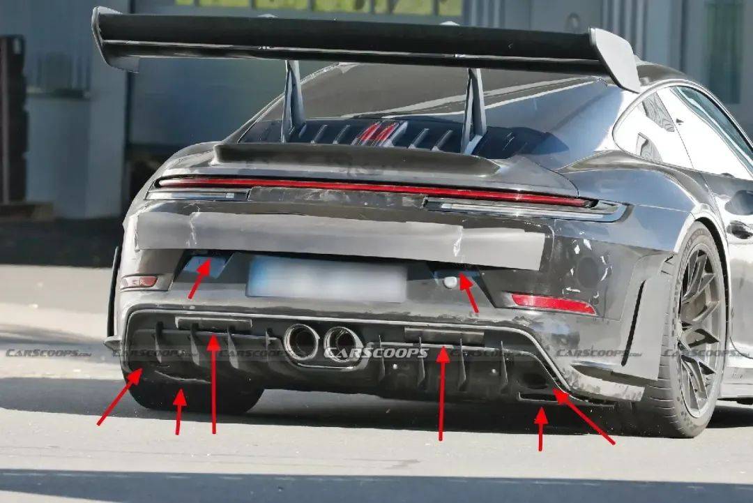 現款車型的擴散器帶有6片導流鰭,而最新測試車則增至8片,此外,這些導流鰭并非完全垂直布置,而是呈一定角度傾斜。擴散器中央似乎配備了尺寸稍大的排氣管,并且擴散器本體還將額外增加兩個排氣出口。