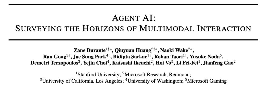 這篇長達80頁的綜述名為《Agent AI: Surveying the Horizons of Multimodal Interaction》,由李飛飛等14位來自斯坦福大學和微軟的專家聯合撰寫。