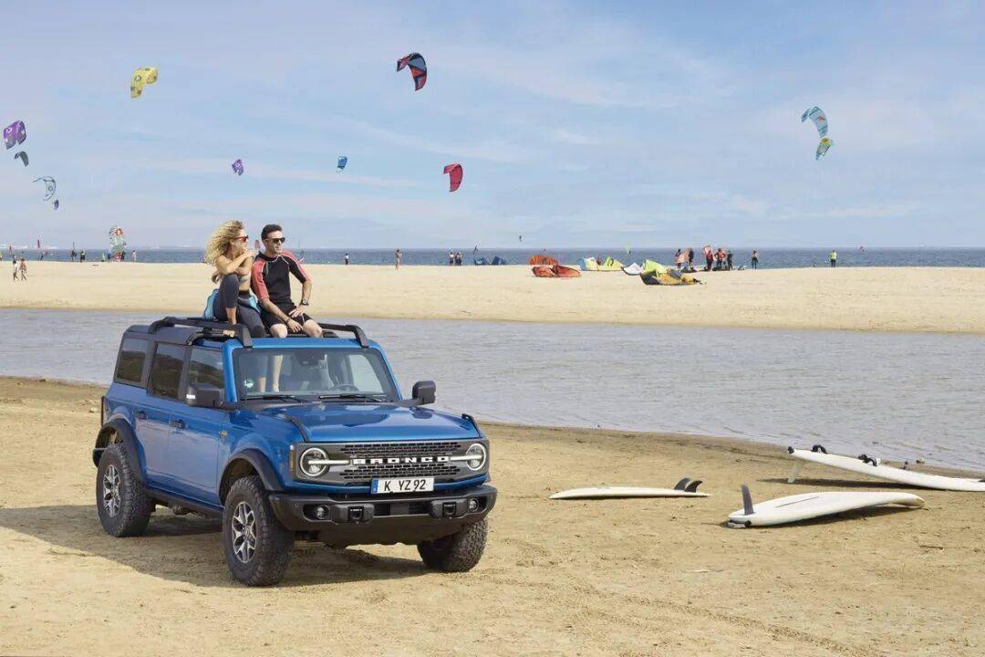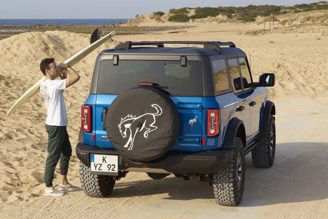 Bronco裝備復(fù)古元素的圓形大燈、橫向進(jìn)氣格柵、可拆卸車頂(軟頂/硬頂)及外掛備胎,致敬初代車型。四門版Bronco車長(zhǎng)4878mm,軸距2850mm,接近角/離去角達(dá)43.2°,離地間隙294mm,涉水深度850mm。