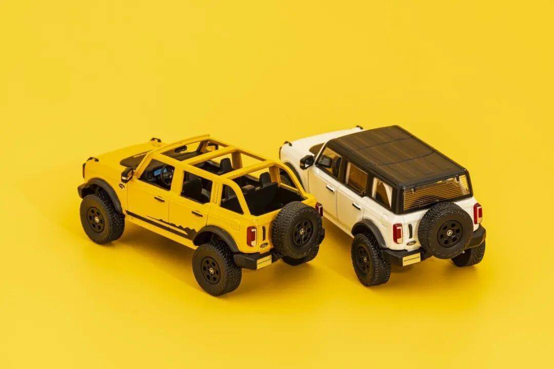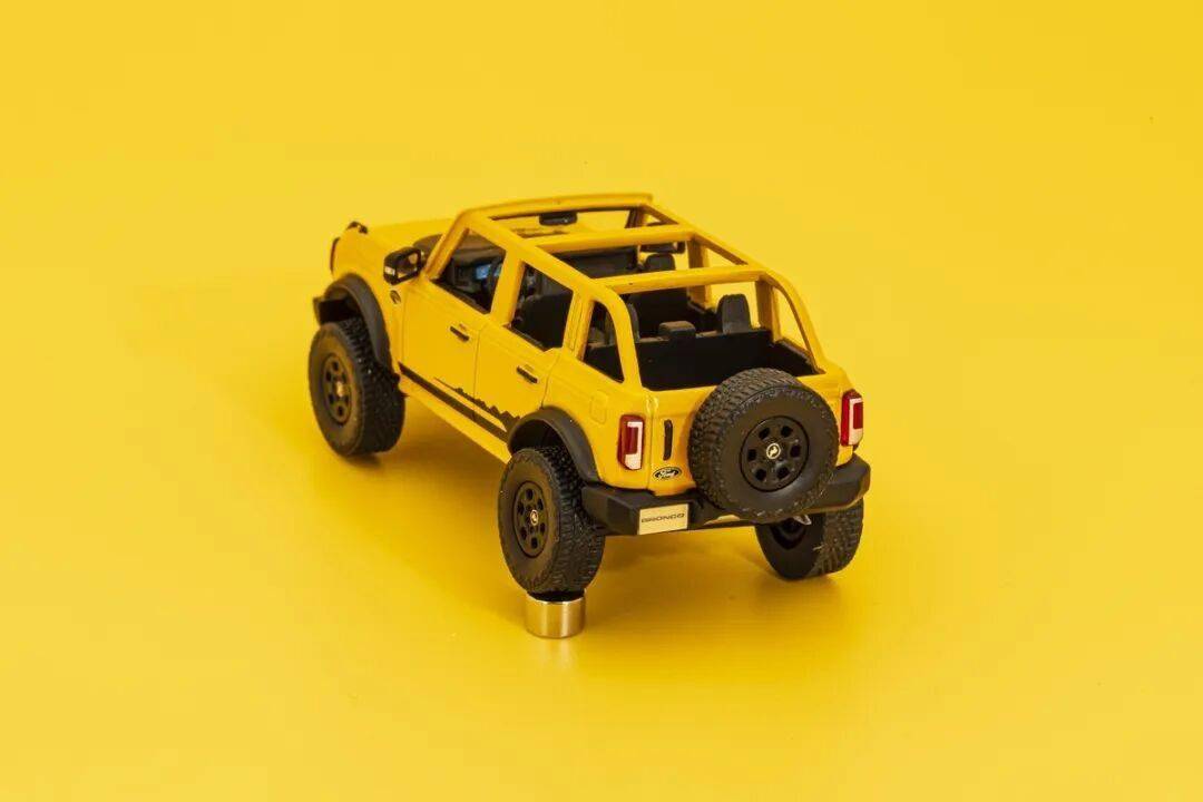 模型的復(fù)古原型大燈是涂燈,包括車頭的BRONCO標(biāo)志都是涂上去的;模型的中網(wǎng)細(xì)節(jié)為浮雕刻畫,前杠的細(xì)節(jié)都是浮雕刻畫,不過對(duì)于粗狂的烈馬,這些也無所謂;模型的輪子沒有轉(zhuǎn)向功能,取而代之是擺臂懸掛,因?yàn)槭枪草S,輪子也沒有外八情況。