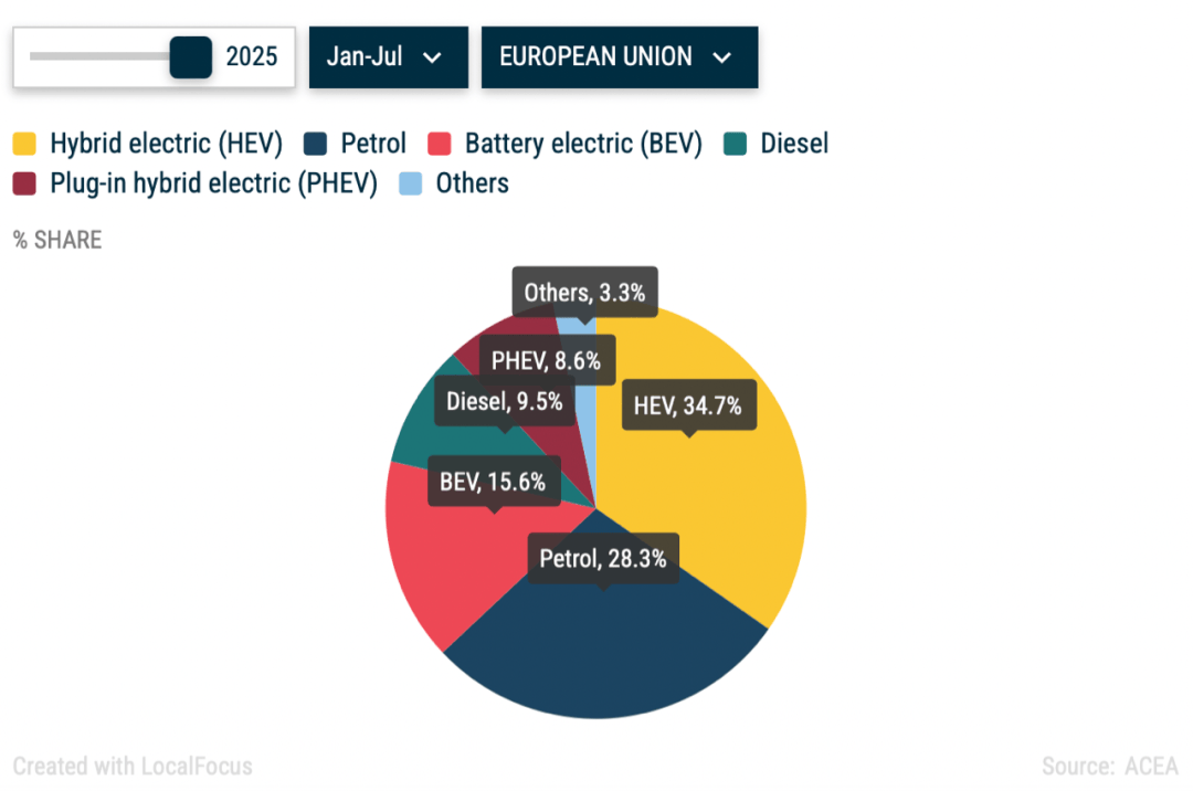 ACEA數據顯示,今年1-7月份,歐洲BEV份額為15.6%,PHEV為8.6%,比去年同期增加了4.5個百分點。如果把兩者相加,占比則達到24.2%,這一市場體量在歐洲位列第三,僅次于HEV和汽油車。