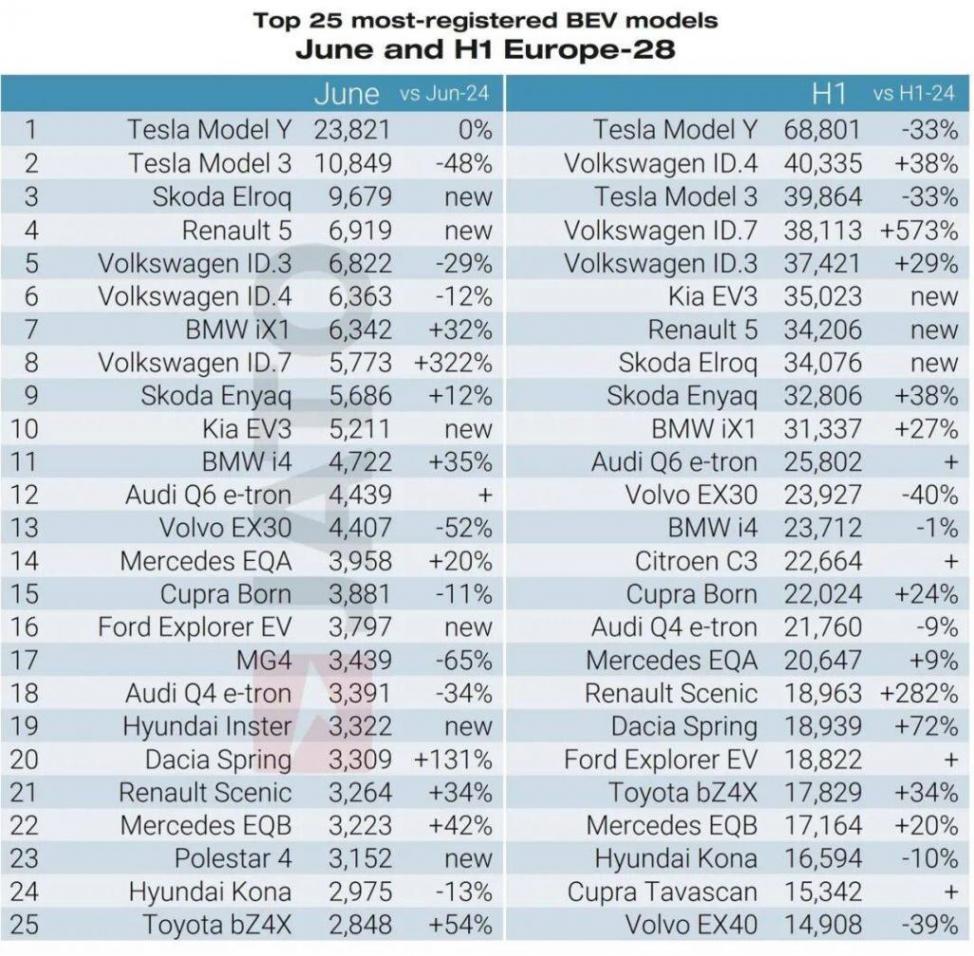 然而,正如前文提到,特斯拉今年前7個月銷量同比跌幅超43%,7月份比亞迪的市場滲透率已首次超過特斯拉。作為品牌的銷量擔當,今年前五個月,Model Y單月銷量均出現同比下滑,前四個月單月銷量同比跌幅更在40%以上,一度更達到56%。雖然Model Y依然是今年上半年歐洲最暢銷的BEV,但33%的同比跌幅已經是一個危險信號。