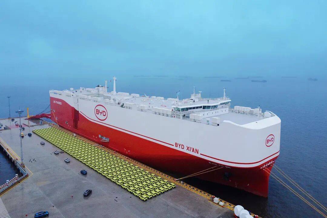 按計劃,比亞迪2026年前將建成由8艘汽車運輸船組成的“出海艦隊”,屆時船隊總裝載量將躍升至6.7萬輛,年運力超百萬輛。