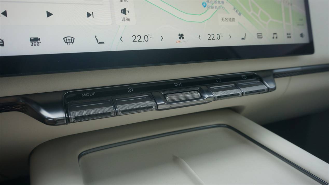 屏幕下方的“鋼琴式”實體鍵設(shè)計也是平臺化的,不過功能定義和007GT上的又不太一樣,從左到右分別是:駕駛模式切換、后備箱開關(guān)、音量調(diào)節(jié)(滾輪)、空調(diào)內(nèi)外循環(huán)切換,以及電動手套箱的開關(guān)(沒錯,這臺車的手套箱是電動打開的,但關(guān)上需要手動)。而我覺得還可以補上空調(diào)調(diào)溫、調(diào)風(fēng)量的控件。