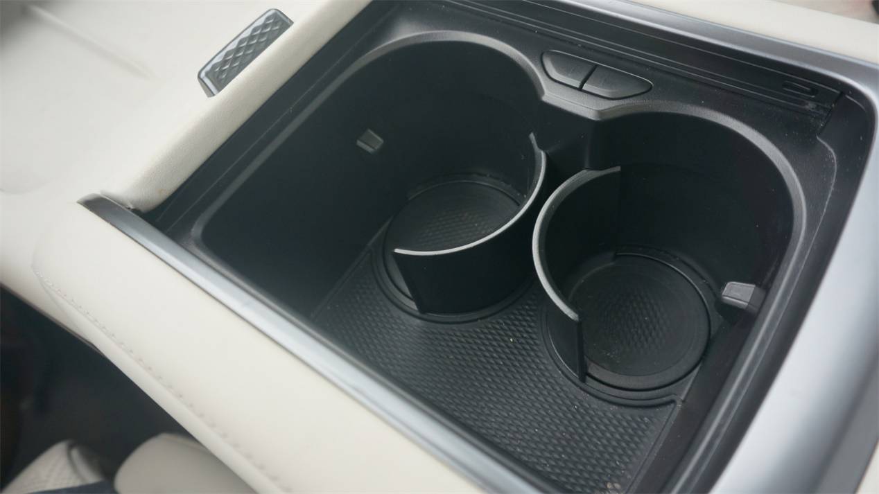 譬如杯架,上層有一個柔性的蓋板,可以拉出來遮蓋杯架,也可以收起,表面包裹了仿皮材質(zhì),不過拉起的手感會有點費勁。內(nèi)部的杯架甚至還帶有可變圍擋的設(shè)計,能夠把圍擋收起變成儲物格,也可以通過外側(cè)的按鈕將圍擋重新釋放出來變回杯架,底部還有防滑設(shè)計。