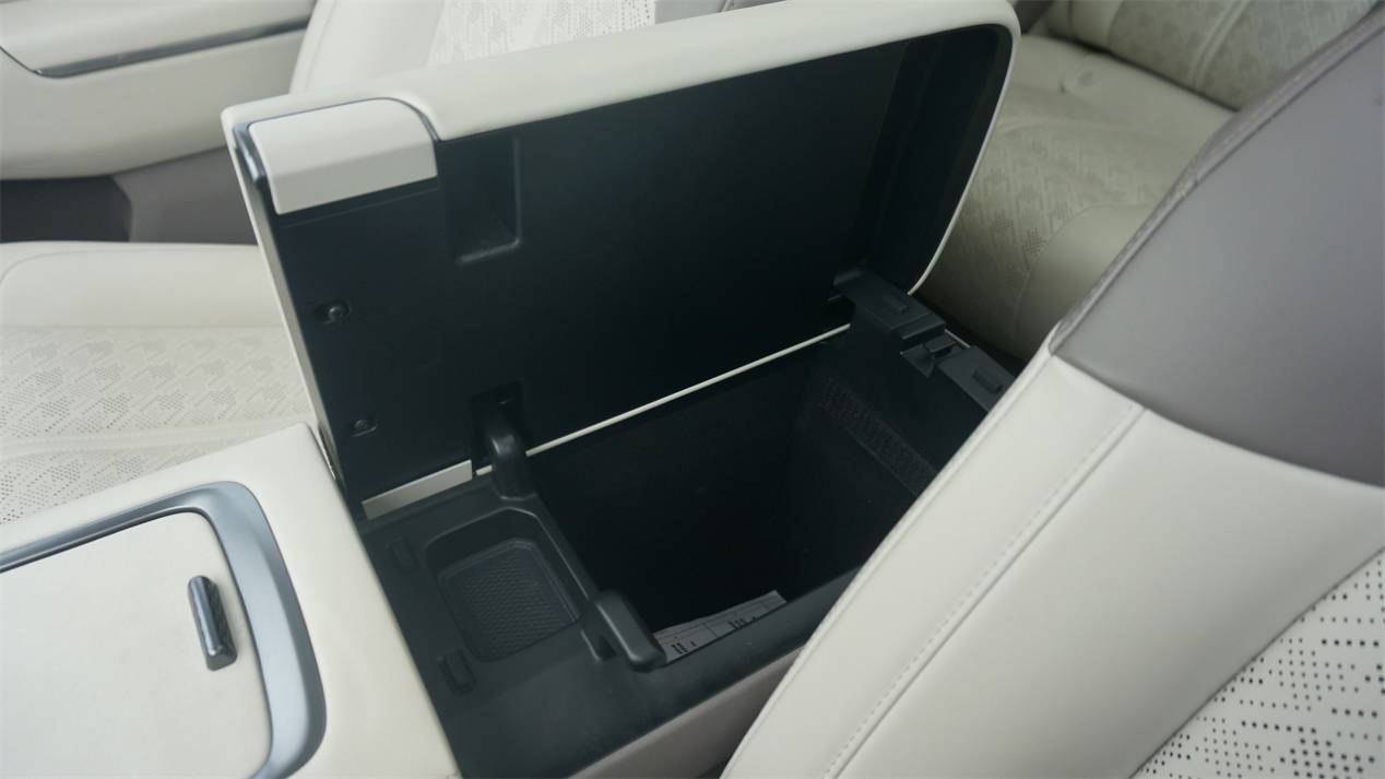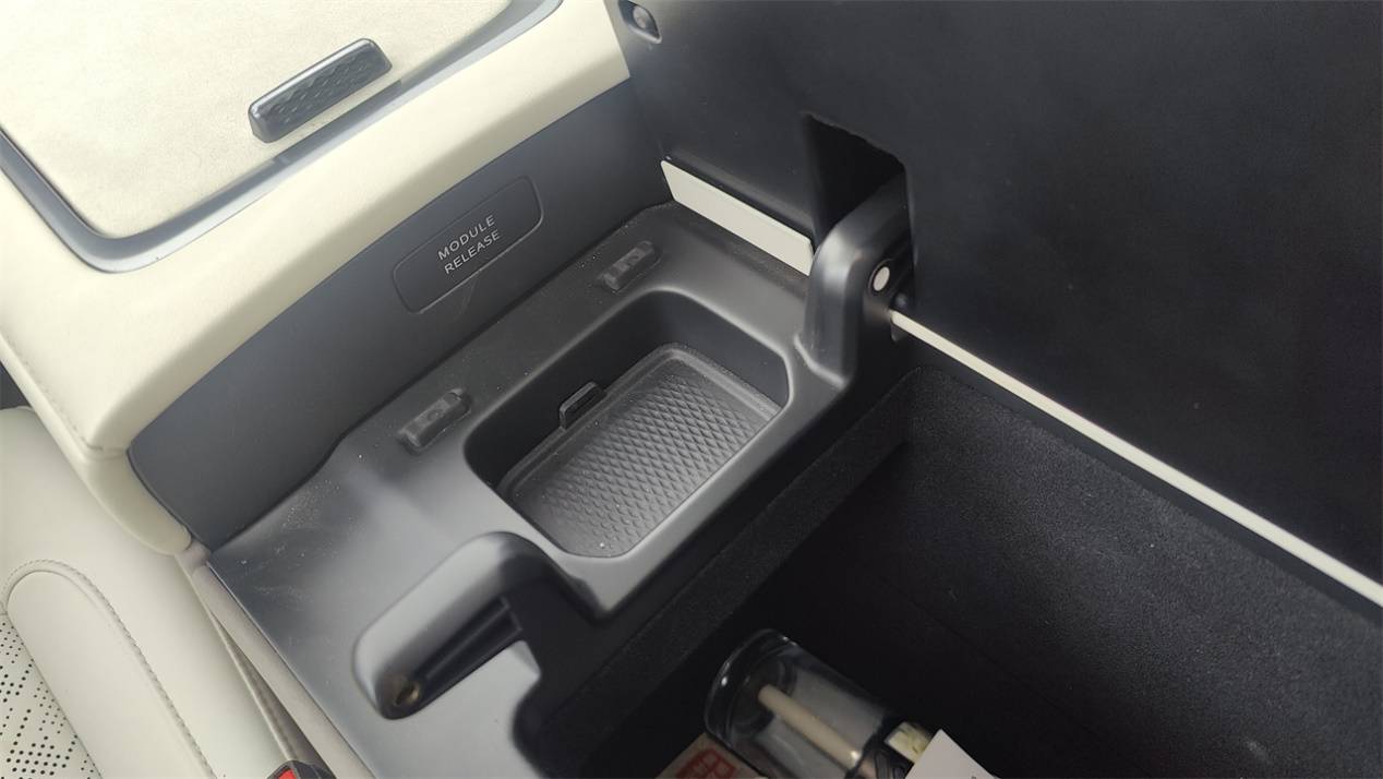 至于為什么會把出風(fēng)口安置在B柱上呢?除了出風(fēng)更均勻之外,還有一個很重要的原因:副中控臺被別的設(shè)計占據(jù)了空間。Console的后方除了帶有一個隱藏的儲物格之外,下方還有一個把手;同時打開扶手箱之后,扶手箱前方隱藏了一個按鍵,按下的同時拉起把手可以把Console的整個后半部分拆除。這部分其實是給用戶自行更換選裝的車載冰箱準(zhǔn)備的。