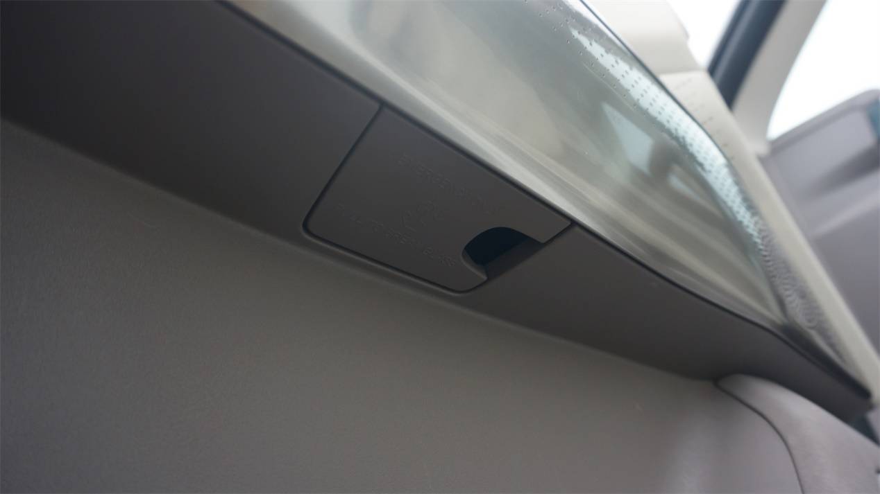 備用的應(yīng)急機(jī)械把手藏在了一個非常深的位置——車門扶手的底部,不貓下腰去找根本看不到。和“一鍵破窗”的功能一樣,都是只能給車內(nèi)人員應(yīng)急脫困用的。