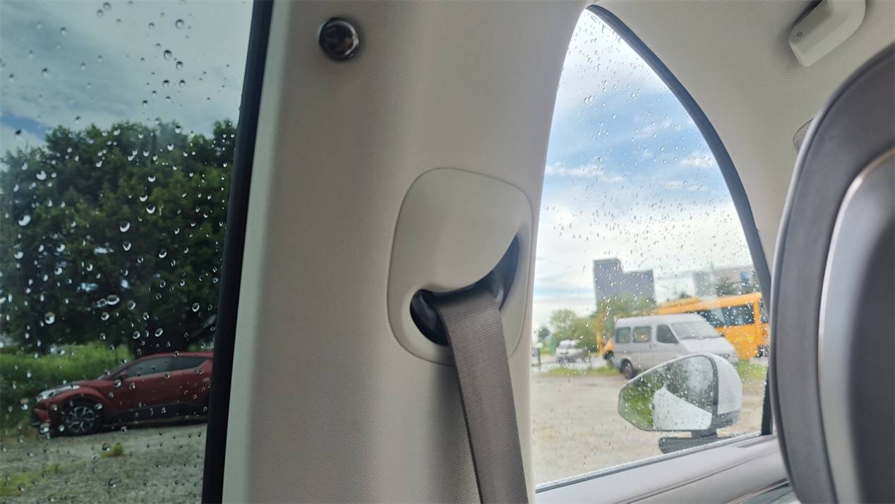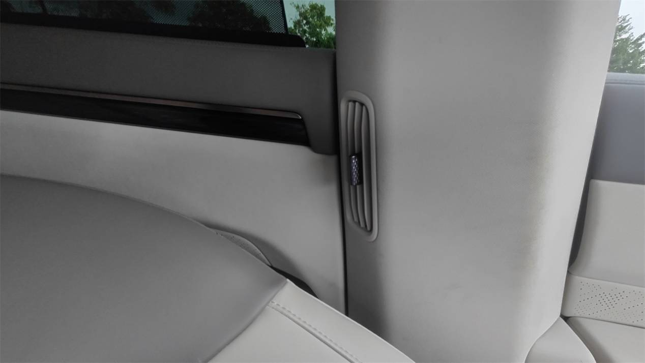 一個有趣的細(xì)節(jié):后排的出風(fēng)口是位于B柱上的,當(dāng)前排座椅進(jìn)入小憩模式時,靠背大角度放倒,靠背會直接越過后排空間,此時后排的出風(fēng)口會直接吹到休息的前排乘客頭部。短暫休息一下還好,睡覺時間長了要小心頭風(fēng)哦~