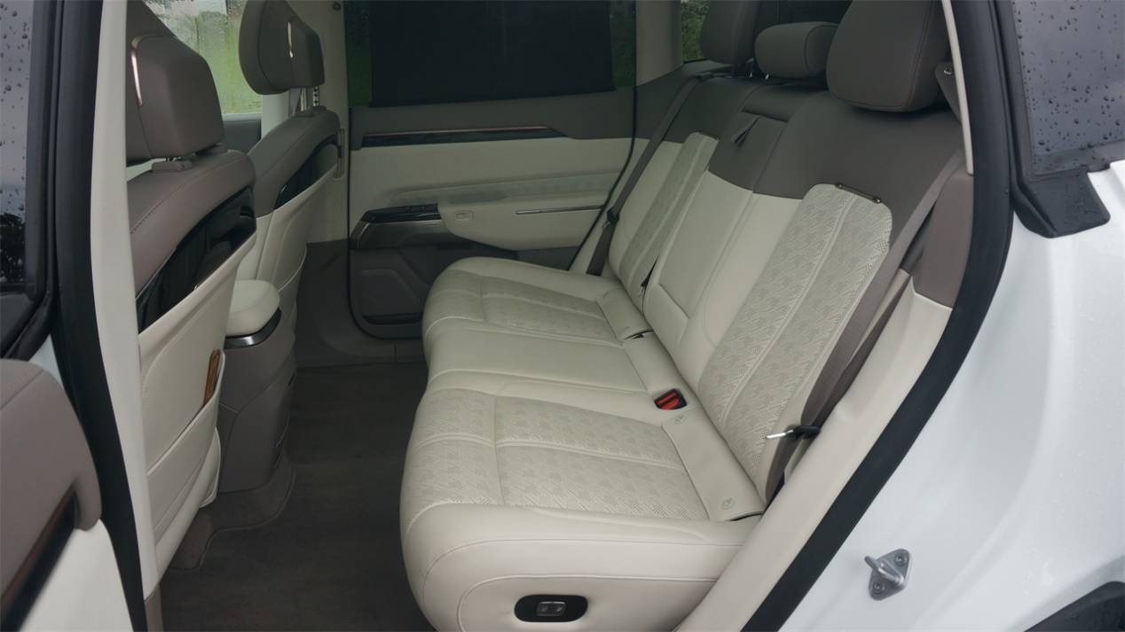 后排的表現(xiàn)自然是不能拉胯的。有了充裕的空間發(fā)揮,7X的后排座椅非常寬大厚實,雖然面料的手感不算很細(xì)膩,但是坐起來能夠很好地兼顧舒適性與支撐性,坐墊的長度很充足,加上靠背有比較大的角度調(diào)節(jié)范圍,要找到自己適合的坐姿并不難。中部還有一個很寬大的扶手,內(nèi)部隱藏了儲物格和USB口,后排乘客充電不用再貓下腰了。