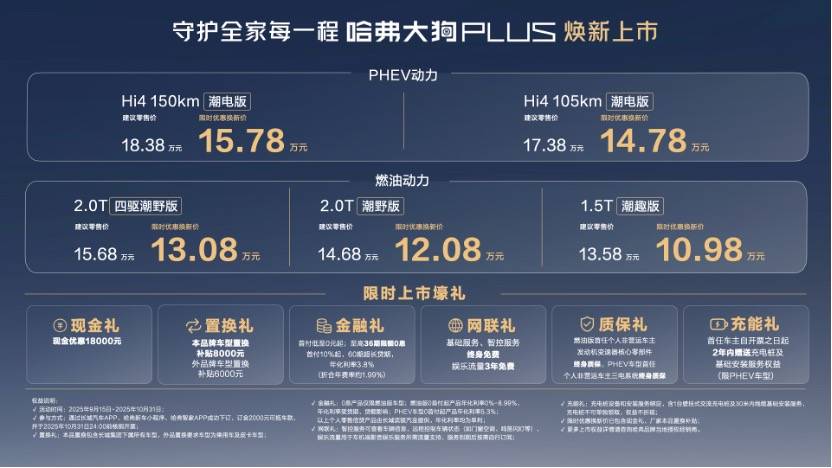 哈弗大狗PLUS推出PHEV版和燃油版兩種動力共5款配置車型,適合家庭使用的泛越野SUV,限時優惠換新價10.98萬元起,長城又把方盒子玩透了。