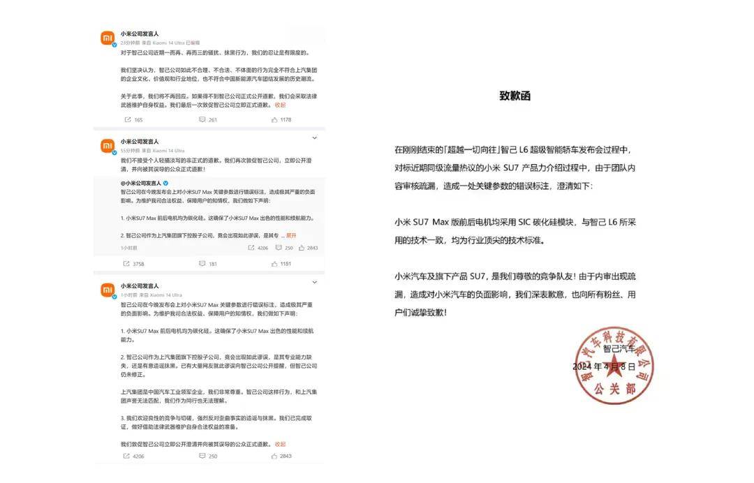去年4月初,智己L6 發布會因錯誤標注了小米SU7電機信息,被小米汽車連發3條微博要求道歉。