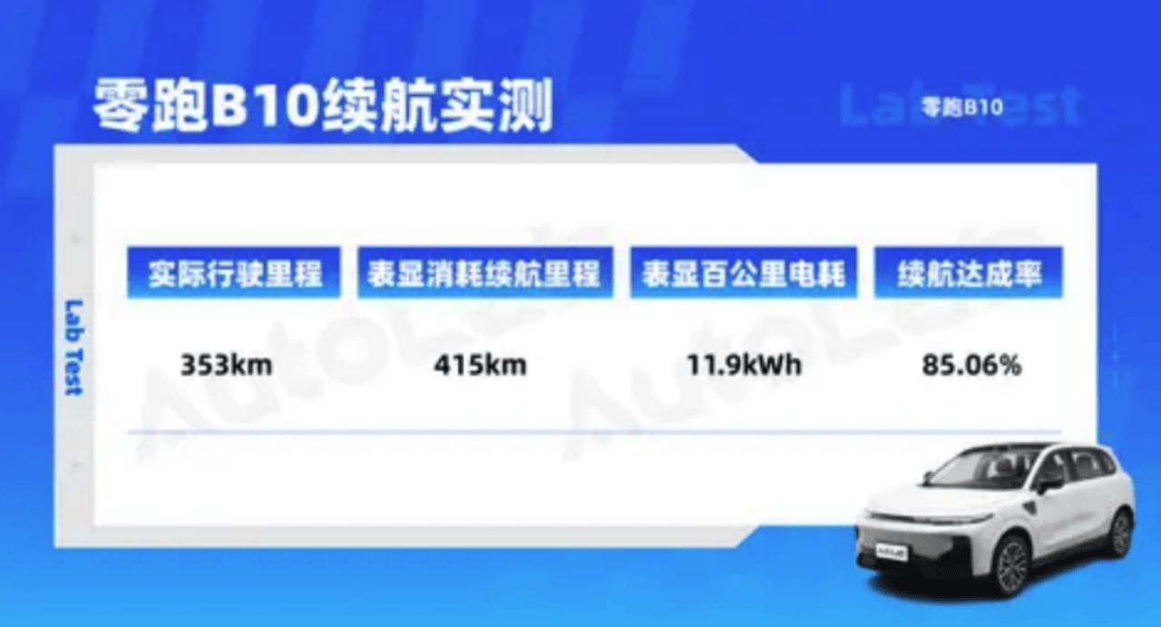 在網上查了查,「Autolab」、「汽車天涯」測試過零跑B10的電耗。這兩家自媒體的創始人我比較熟,人靠譜,也都有從業多年的經驗。Autolab測試零跑B10高架/高速85.06%達成率,汽車天涯測的夏季市區達成率90.3%、高速/省道/山路達成率81.3%。