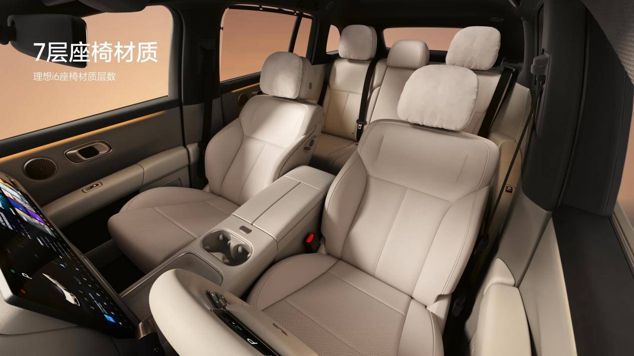 在設計與空間上,理想i6以“鯊魚形態”原創設計打破傳統SUV局限,一體式車身搭配原生雙色、低窗線與掀背造型,既具高級運動感,又實現行業領先的低風阻與低能耗。車身尺寸為4950×1935×1655mm,軸距3000mm,通過低重心與短前后懸設計,打造超3.3米車內縱向可用空間。座椅采用七層材質,標配四座通風、五座加熱與前排十點按摩,后排右側專屬皇后座椅,搭配8.8升智能冷暖冰箱、21.4英寸3K后艙娛樂屏、鉑金音響與側窗隱私簾,構建多元空間模式:“單人床模式”下前排與二排座椅無縫連接,1.83米身高可輕松平躺,配合按摩功能實現SPA級體驗;“i人空間”通過隱私簾與車外攝像頭調取,打造私密安全的獨享環境。靜謐性方面,全車95%聲學材料覆蓋率、雙層夾膠玻璃與自研RNC路噪主動消除技術,實現旗艦級靜音效果。儲物能力同樣出眾,后備廂進深1.1米可容納3個28寸+2個20寸行李箱,下沉式空間可收納雙人露營套裝,標配前備箱(帶照明燈與排水孔)方便日常取放,還首次提供原廠拖掛套裝(含拖掛資質)、自行車架與車頂行李架,適配戶外出行場景。