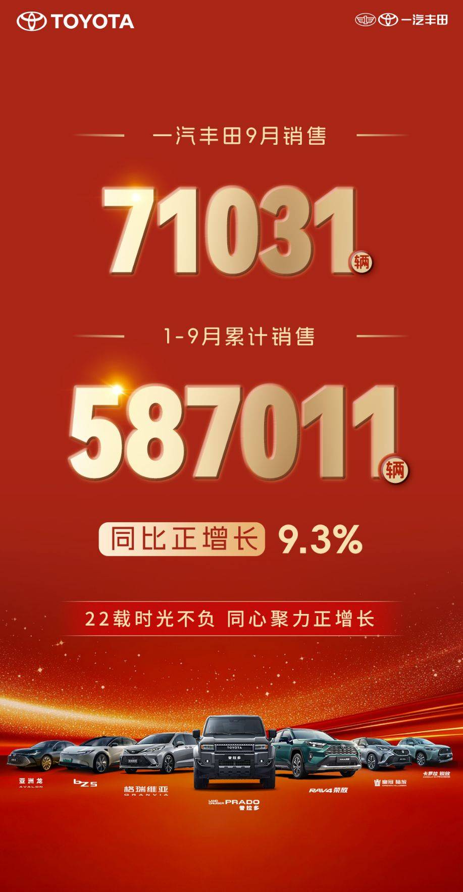 2025年10月1日,一汽豐田率先公布9月銷售業績;9月銷售新車71031輛; 1-9月累計銷售新車587011輛,同比增長9.3%,正增長定式持續延續。