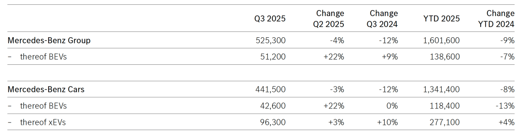 同時,奔馳也公布了2025第三季度及前三季度銷量數據,與寶馬存在一定差距: