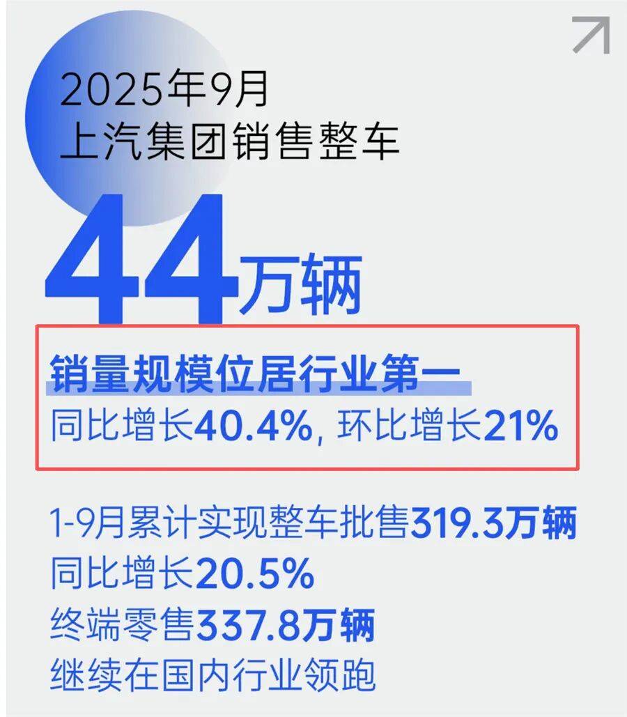 而另一邊,上汽集團9月銷量來到了439,777輛,同比增長超過40%,也超過比亞迪去年同期。值得一提的是,上汽集團官方公眾號發布的海報中,還多了10個字——“銷量規模位居行業第一”,而這行字已經許久沒在上汽集團的銷量海報中出現了。