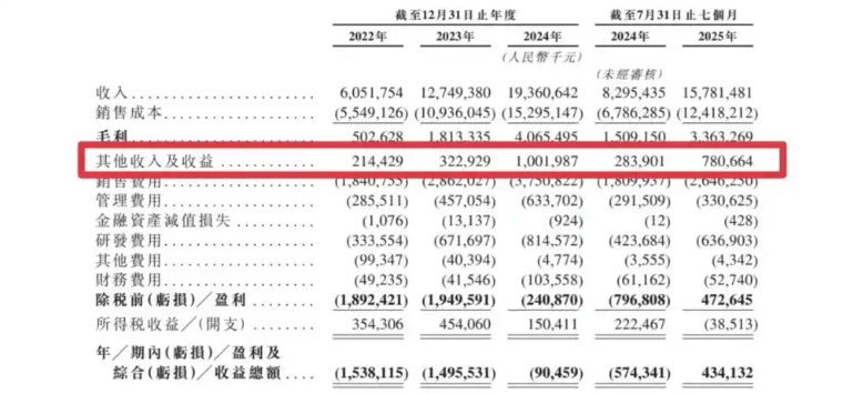 不過,拆分其招股書則不難發現,其盈利的關鍵是在于“其他收入及收益”暴增,去年前7個月,其該項收入不到2.84億,而今年同期漲則至7.8億。