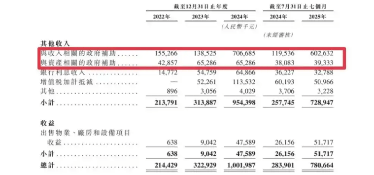 招股書顯示,“其他收入及收益”主要是政府補助和銀行利息收入、增值稅加計抵減等。其中核心是政府補貼,分為收入相關補助和資產相關補助。而嵐圖今年前7個月,此項補助達到6.42億,占其他收入及收益的82%。而倘若減去政府補助的因素,嵐圖今年前7個月的則依然虧損超過2億。